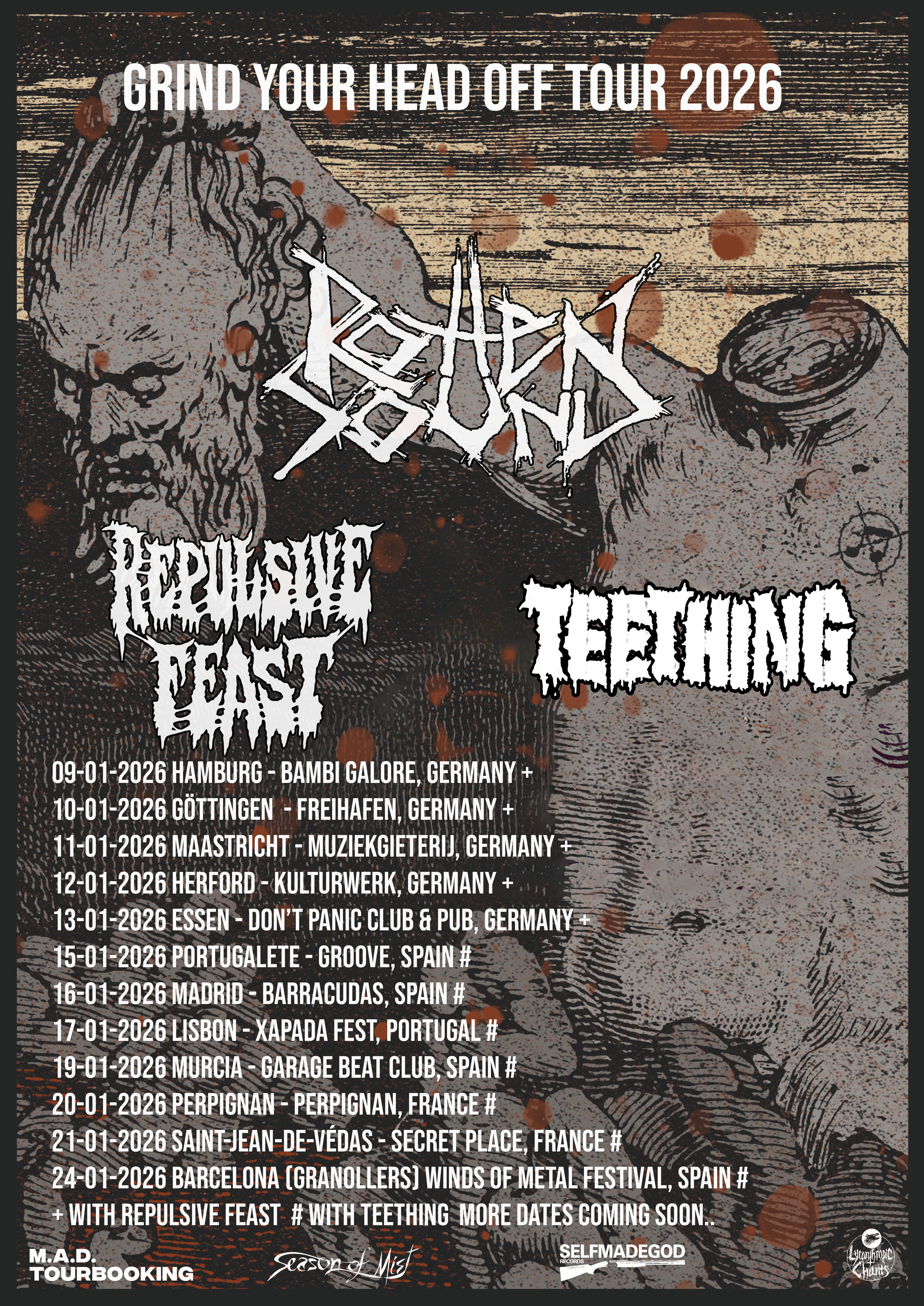 Next year, Rotting Sound will return to the grind with a fresh set of European headline dates in support of Mass Extinction. Following this blistering ride with Repulsive Feast and Teething, the band will return to the U.S. for a special set at Maryland Death Fest celebrating their classic albums Murderworks and Exit.