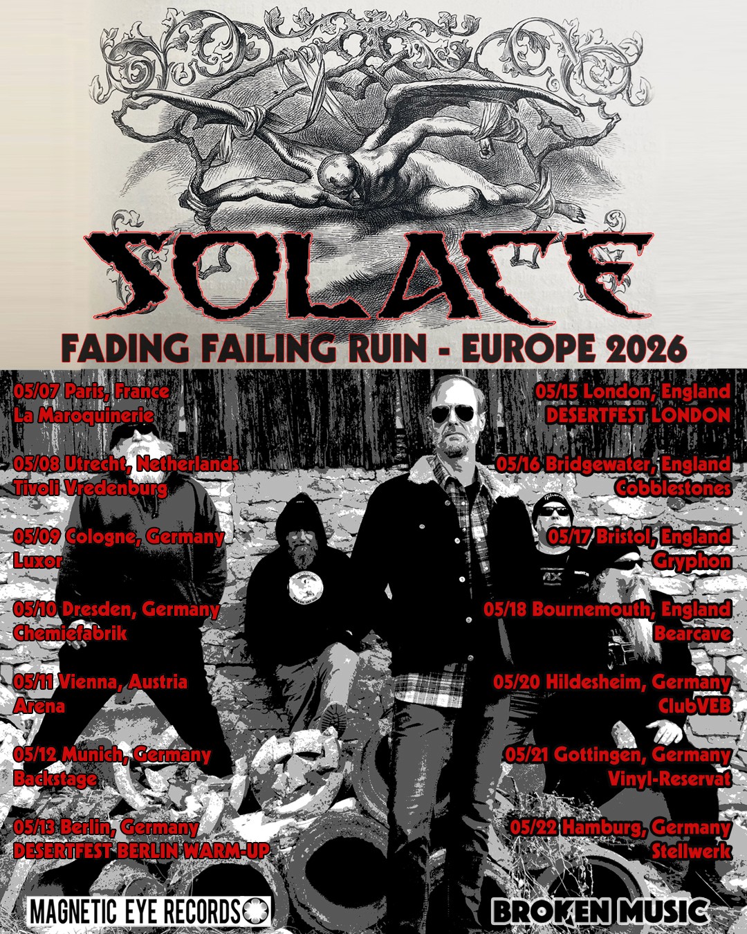 Amazing news for old continent fans of the stoner rock underground: SOLACE will return to Europe on tour in May 2026 on their "Fading Failing Ruin" tour just ahead of releasing their new album, including two festival slots and a string of shows as direct support for HERMANO (feat. former KYUSS vocalist John Garcia).